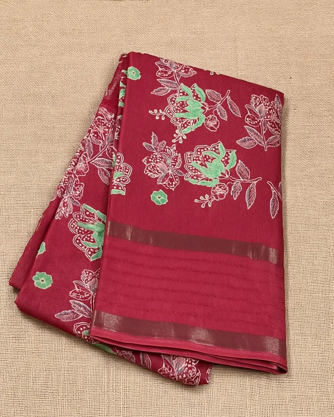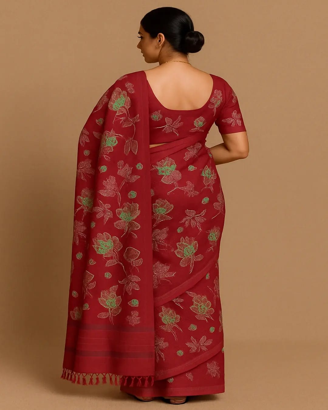 Step into timeless elegance with this beautiful maroon saree adorned with delicate floral prints in shades of green and silver. Crafted for grace and comfort, this saree perfectly blends traditional charm with modern sophistication. The soft fabric drapes gracefully, making it ideal for festive occasions, weddings, and cultural celebrations. Pair it with classic gold jewelry and minimal makeup for a stunning ethnic look that never goes out of style. ✨🌺