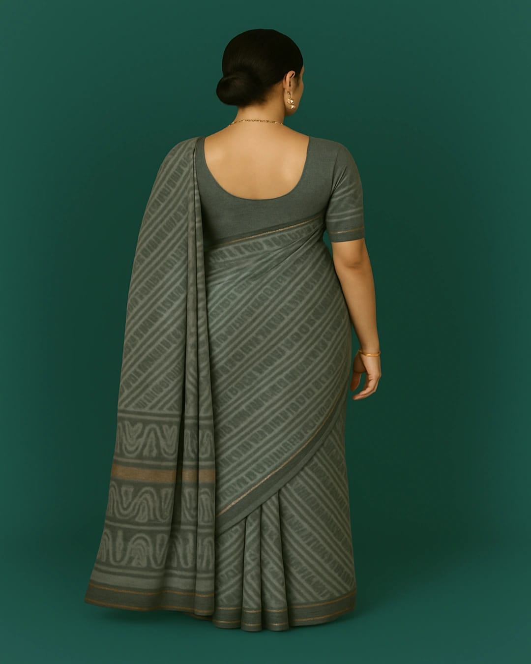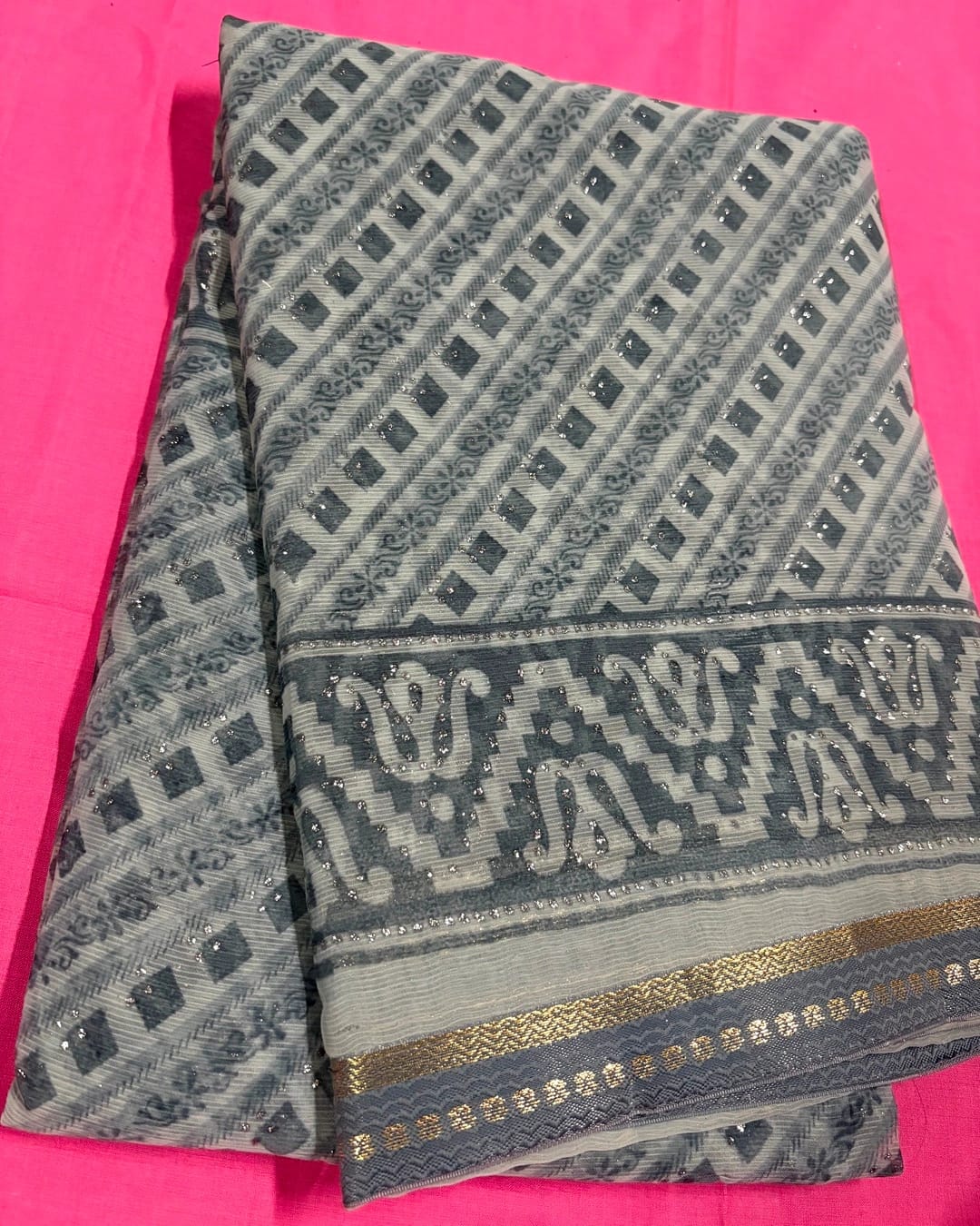 Redefine elegance with this sophisticated grey saree featuring intricate geometric and traditional woven patterns. The subtle blend of diagonal motifs with a beautifully designed border adds a touch of heritage charm, making it perfect for both festive occasions and formal gatherings. Crafted from soft and comfortable fabric, this saree drapes effortlessly to enhance your graceful look. Pair it with gold jewelry and a sleek blouse to complete your timeless ethnic style. 🌿💫