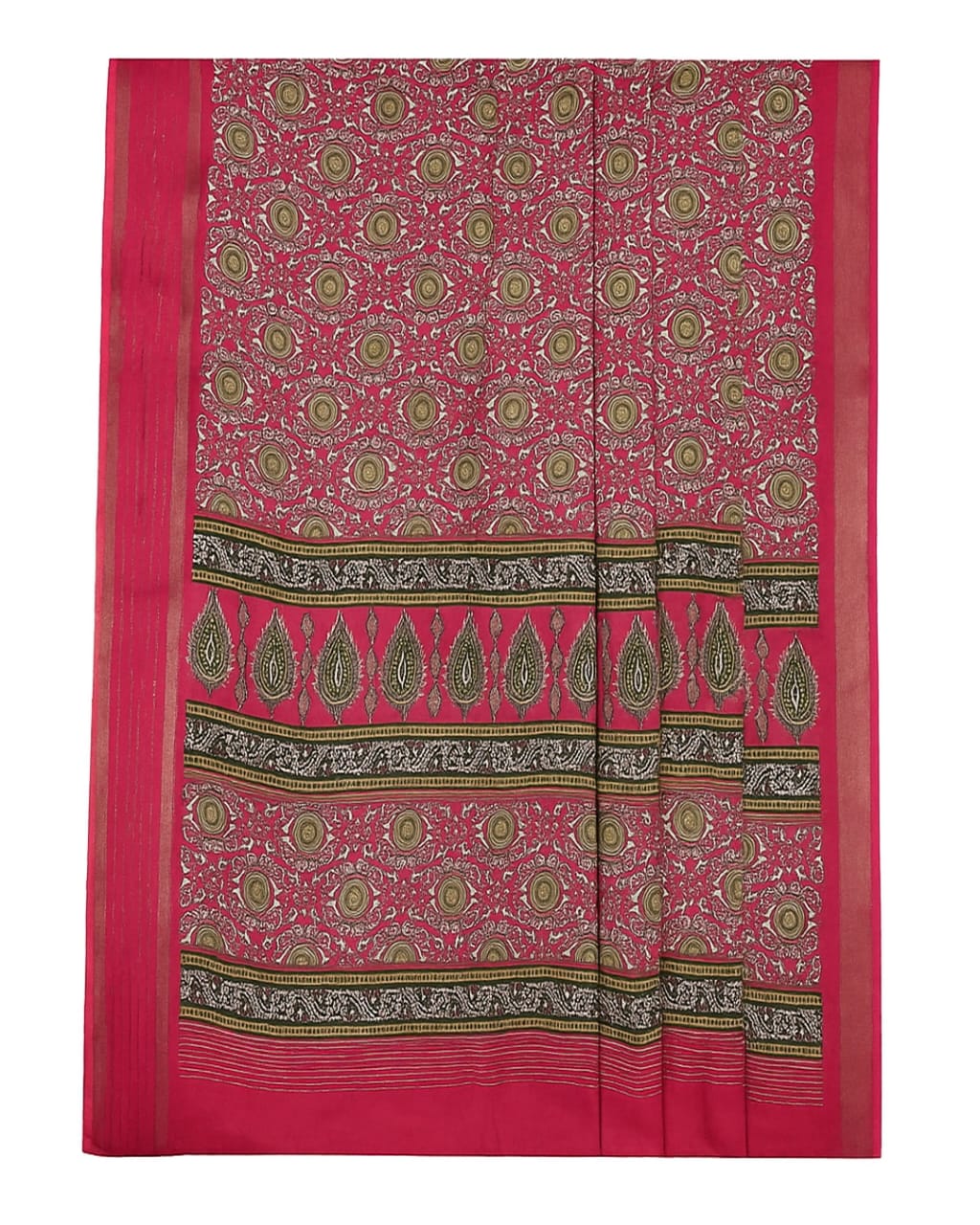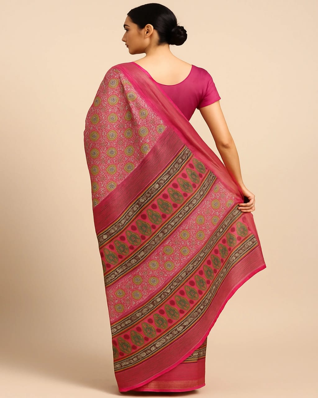 Add a vibrant touch to your ethnic collection with this beautiful pink saree featuring intricate traditional prints in green and gold. Crafted from a soft and lightweight fabric, it ensures all-day comfort while maintaining a graceful drape. The saree is highlighted with bold printed borders and a striking pallu that enhances its festive charm. Perfect for weddings, cultural events, and celebrations, this saree pairs effortlessly with a matching blouse and statement jewelry for a complete elegant look.